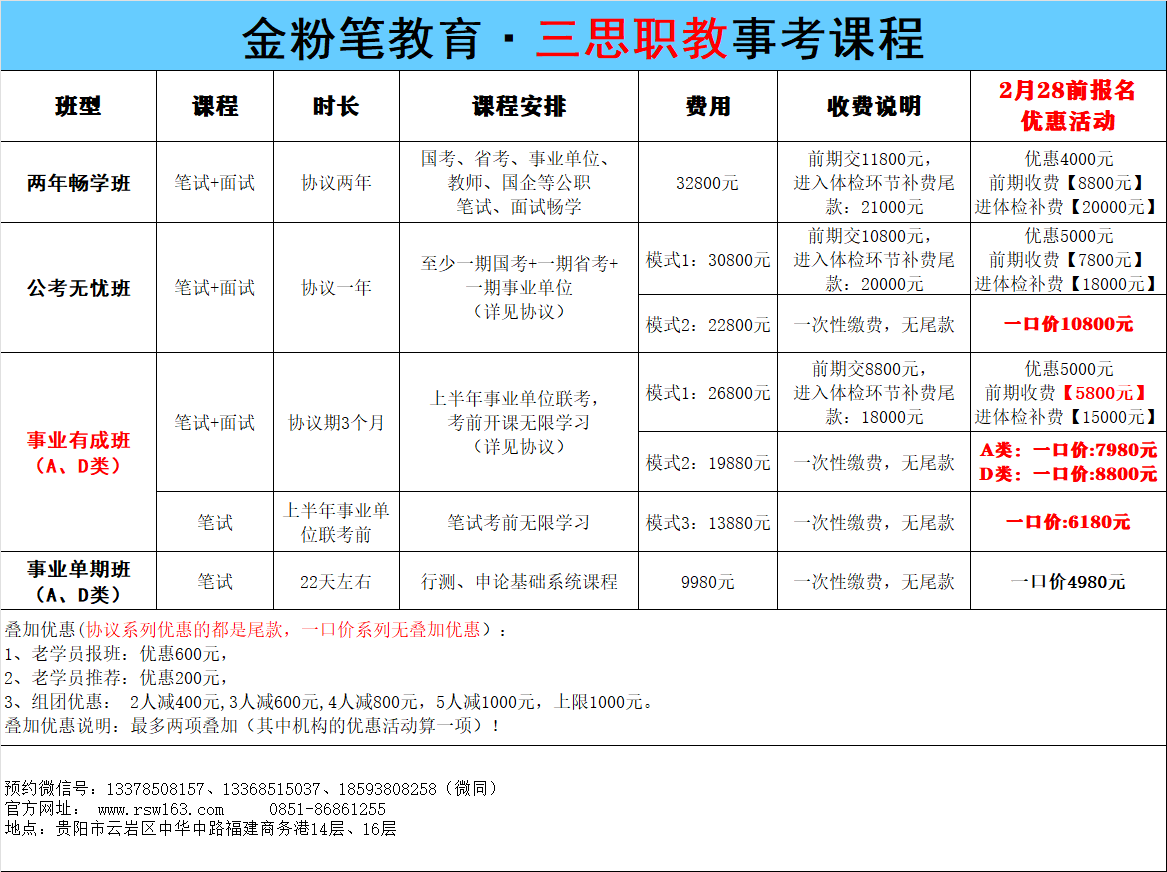 贵州三思职教2026年贵州事业单位考试培训课程来了,贵州事业单位笔试班2月1日、2月25日开课,基础+刷题+模考,逐步提升,不论有学习基础,还是无学习基础,都有对应班次可以学习,班次不同,费用不同,26年贵州事业单位笔试班预约及咨询:13368515037(微同)。