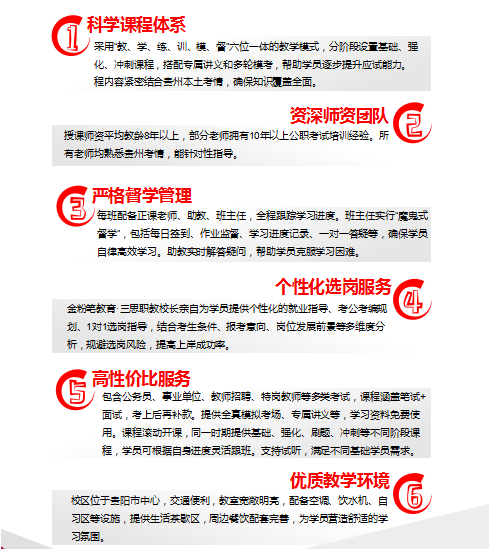 授课师资平均教龄8年以上,部分老师拥有10年以上公职考试培训经验。所有老师均熟悉贵州考情,能针对性指导。