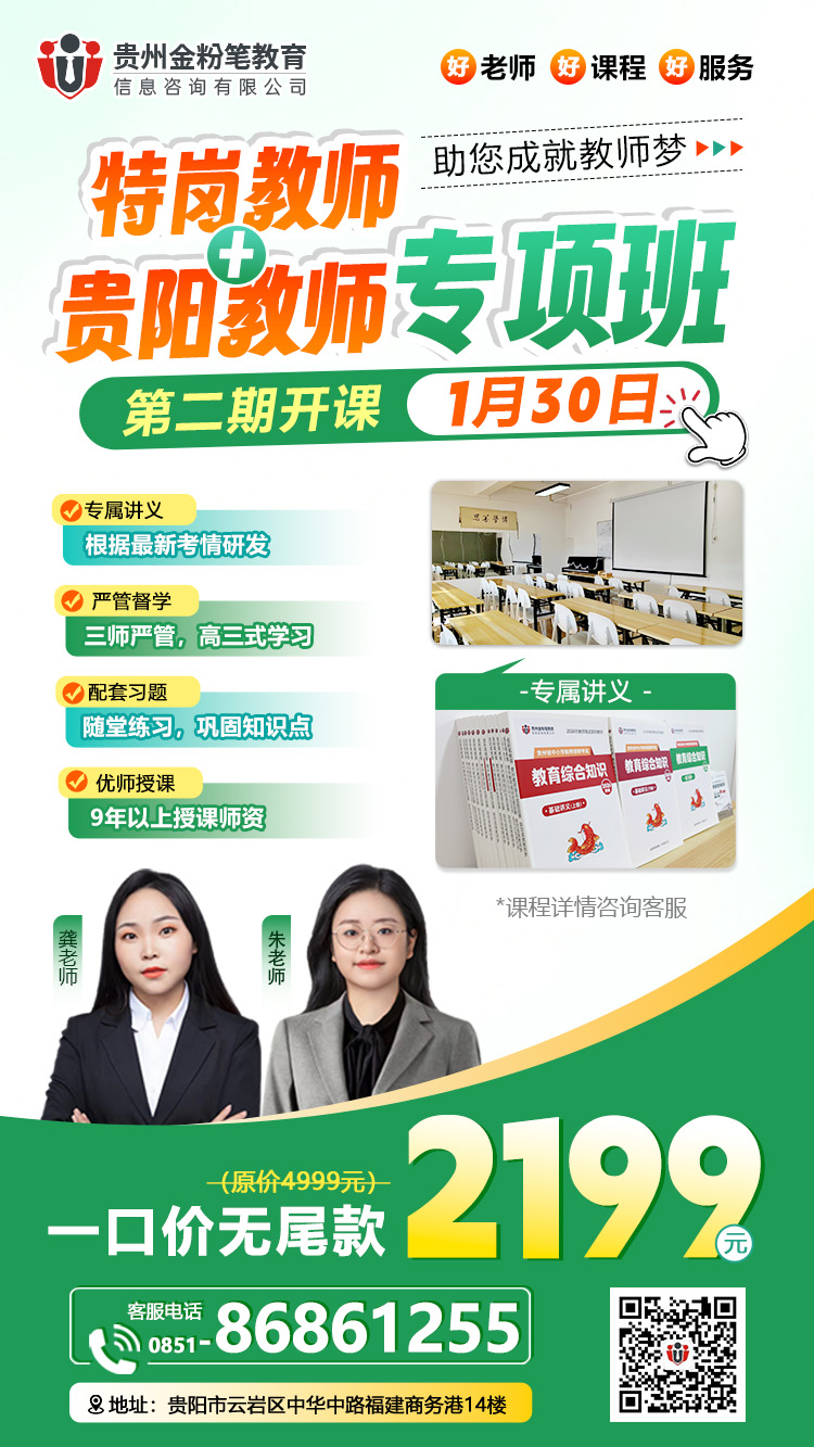 贵州金粉笔2026年贵阳教师寒假培训班课程来了,笔试科目教育综合知识,寒假+节假日+周末,适合在职备考人员学习,现在预约或报班,可享相关课程优惠。2026年贵阳教师寒假培训班预约或咨询:13368515037(微同)。