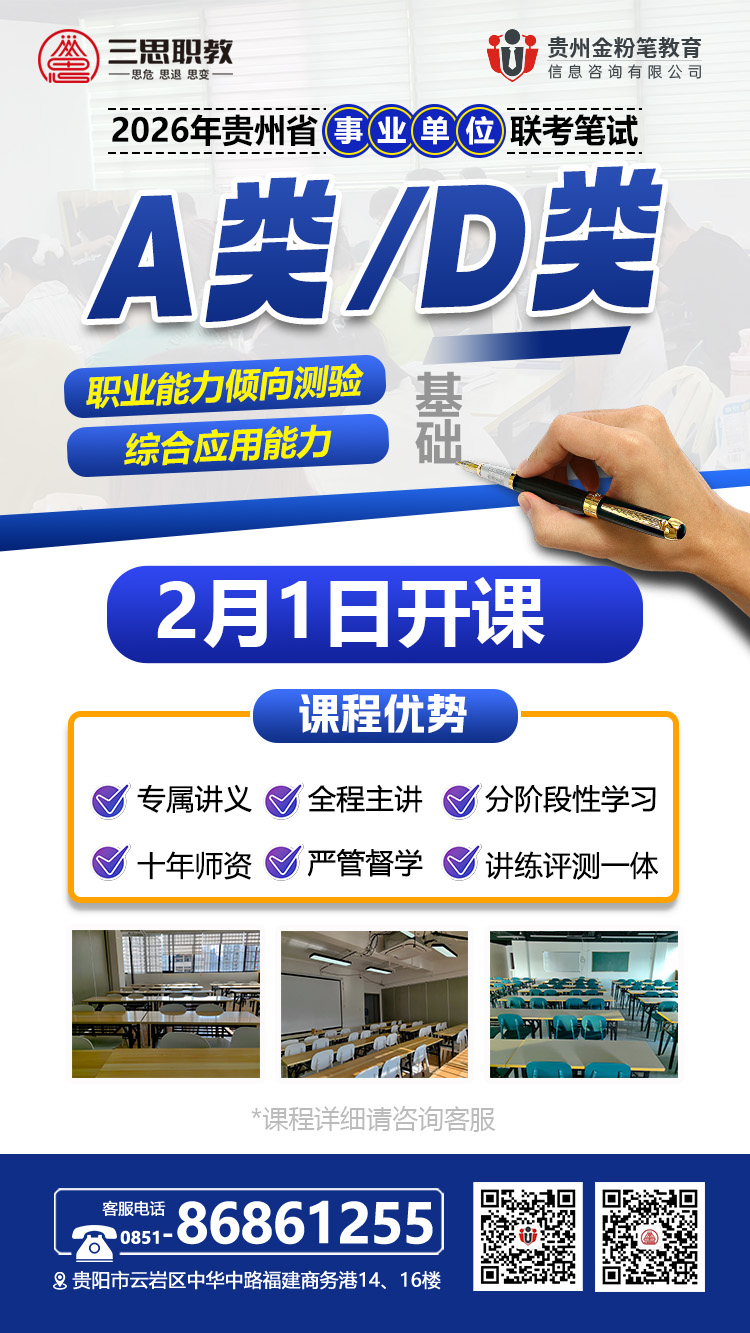 贵州金粉笔教育2026年贵州事业单位联考D类笔试班2月1日开课,教师笔试+面试全年畅学,9年以上资深师资全程主讲,专属讲义+习题训练,紧跟贵州联考考情,严管督学(主讲老师+班主任+助教老师+教务老师督学),联考D类早准备,早学习,26年贵州事业单位联考D类笔试培训班预约或咨询:13368515037(微同)。