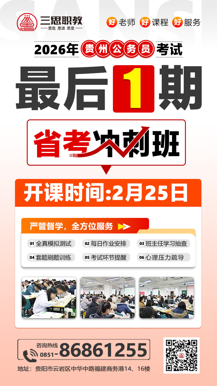 贵州三思职教2026年贵州省考笔试刷题班来了,开课时间2月25日,考前刷题冲刺,26年贵州省考笔试刷题班预约及咨询:13368515037(微同)。