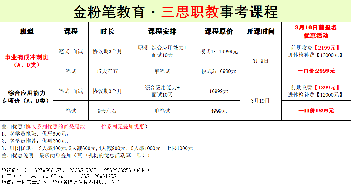 贵州金粉笔2026年贵州事业单位联考D类笔试冲刺班来了,冲刺班3月9日、3月19日开课,刷题+模考,考前全力备考提升,26年贵州事业单位D类笔试冲刺班预约及咨询:13368515037(微同)。