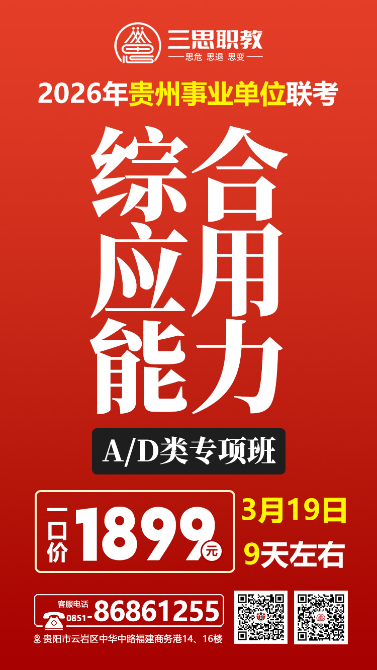 贵州三思职教2026年贵州事业单位联考A类笔试冲刺班3月19日开课,刷题+模考,讲练结合,9年以上资深师资全程主讲,专属讲义+习题训练,紧跟贵州联考考情,严管督学(主讲老师+班主任+助教老师+教务老师督学),联考A类早准备,早学习,26年贵州事业单位联考A类笔试冲刺班预约或咨询:13368515037(微同)。