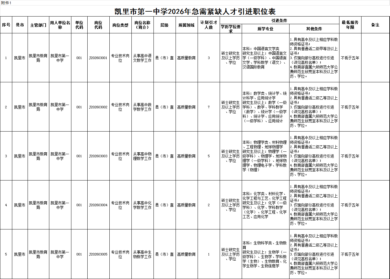 附件:1.凯里市第一中学2026年急需紧缺人才引进职位表
