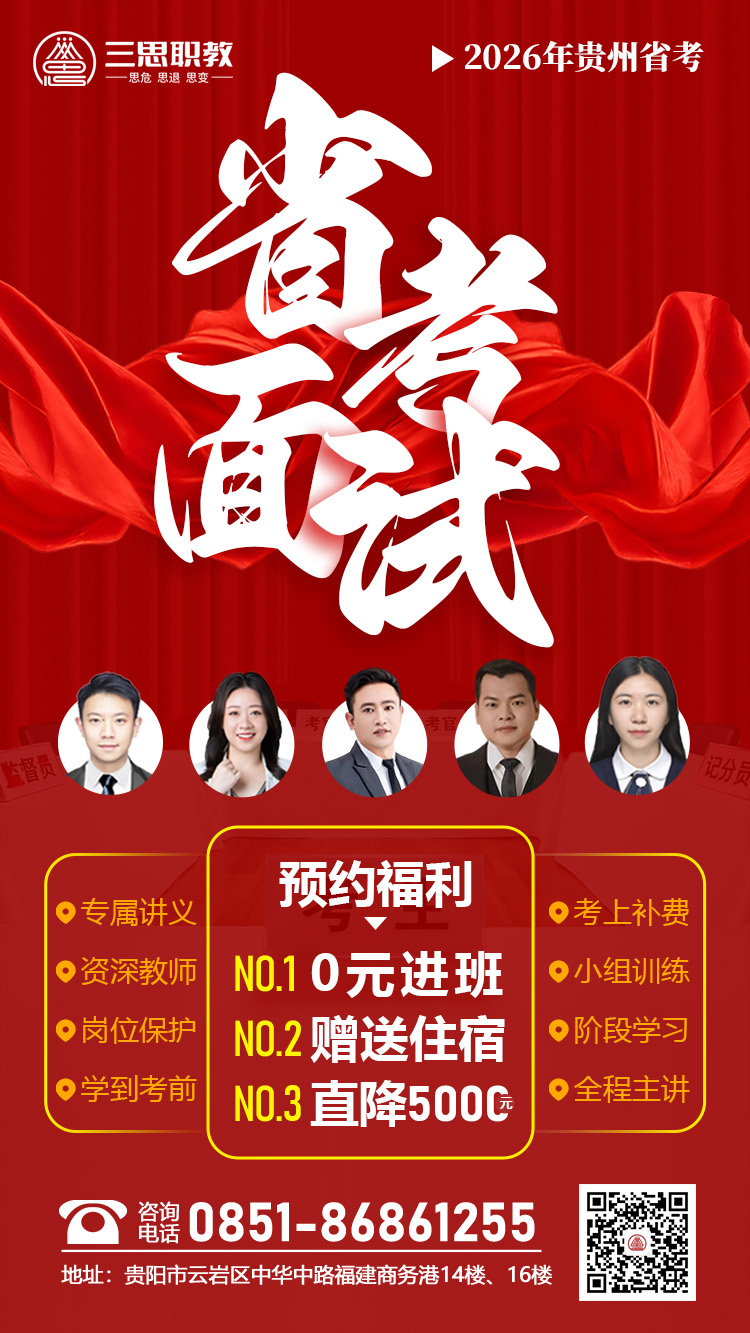贵州三思职教2026年贵州省考面试培训班来了,在笔试成绩公布前,预约或报省考面试班,不论笔试排名分差,可0元入学,在学习,进入体检后再交费,9年以上专业公培主讲授课,讲练评考测相结合,三分理论,七分实战,注重考生答题思维和表达,接地气、有新意,反对模式化培训,2026年贵州省考面试班预约及咨询:13378508157(微同)。