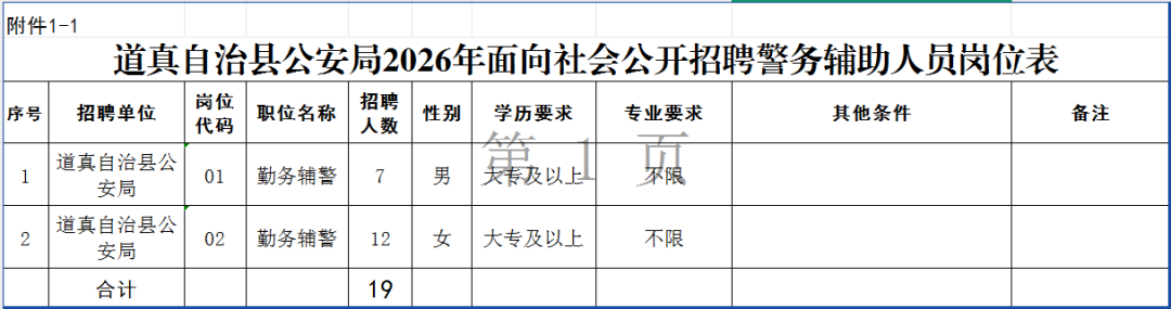 道真自治县公安局计划面向社会公开招聘警务辅助人员19名,主要为公安机关日常警务活动及相关工作提供辅助支持,不具有人民警察身份,所有应聘人员须服从岗位调配。具体招聘岗位及条件详见附件1。