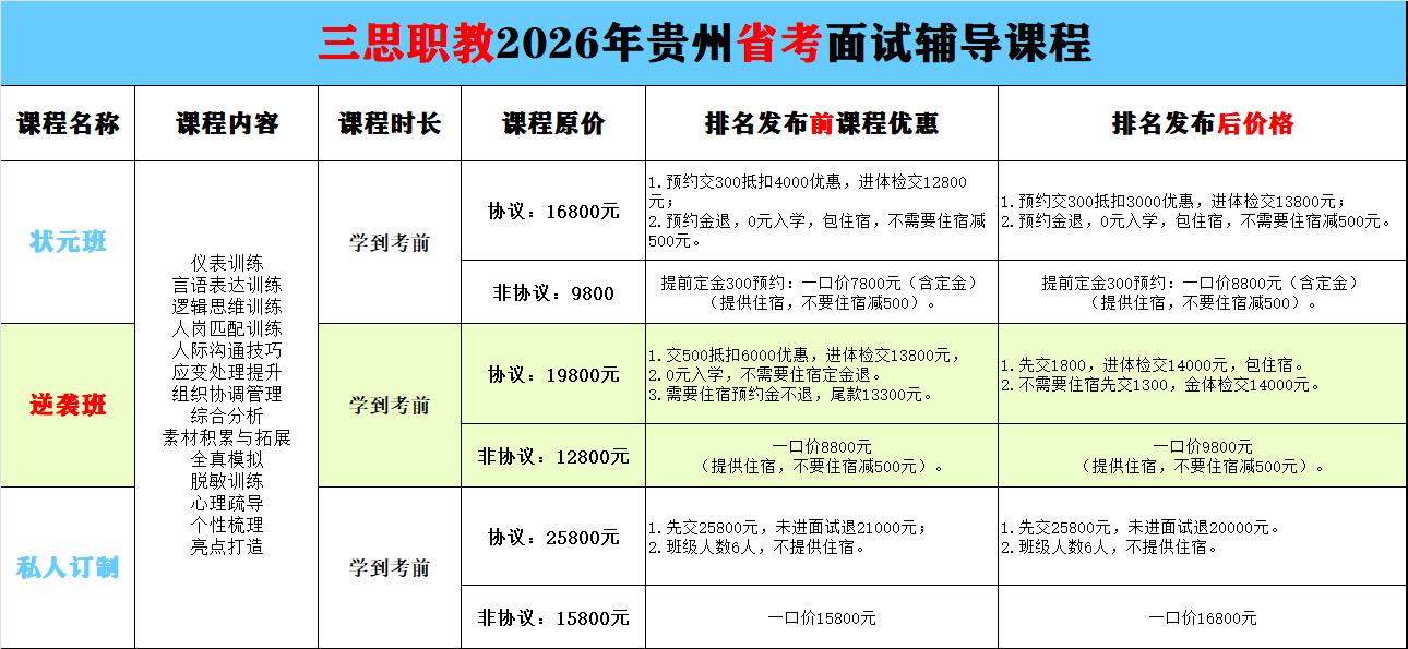 贵州三思职教2026年贵州省考面试培训课程来了,第一期面试班4月12日,第二期面试班4月14日,贵州省考面试4月25日至26日,省考面试时间紧,面试训练抓紧,贵州省考面试班预约及咨询:13368515037(微同)。