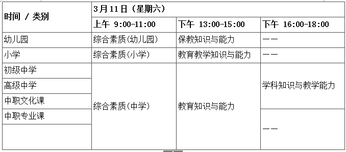 3月11日(星期六)。贵州省2017年上半年中小学教师资格考试笔试所有类别、科目均采用纸笔考试方式进行,每场考试时间为120分钟。