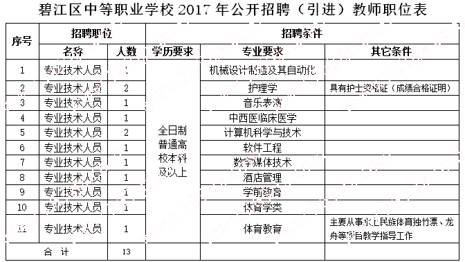 根据《事业单位人事管理条例》、人事部令第6号和《关于印发<贵州省事业单位公开招聘操作办法(试行)>的通知》(黔人社厅发〔2013〕10号)等文件精神,结合我校实际,决定面向社会公开招聘(引进)教师13名(祥见“碧江区人民政府网站”和“铜仁市碧江区人力资源和社会保障局网站” 上公布的《铜仁市碧江区2017年公开招聘(引进) 高中(中职)教师实施方案》)。