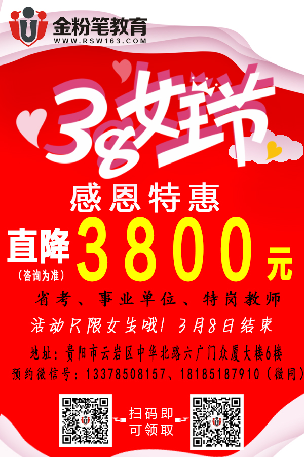 金粉笔教育感恩特惠“3.8”女王节,即日起,凡是报省考笔试班、特岗面试班、事业单位笔试班等全年班直降3800,非协议班直降380。(注:此活动仅限女生,时间截止于3月8日24:00)