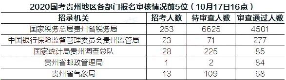 2020国考贵州地区各部门报名审核情况前5位(10月17日16点)