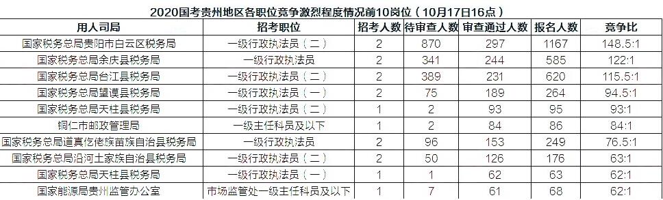 2020国考贵州地区各职位竞争激烈程度情况前10岗位(10月17日16点)