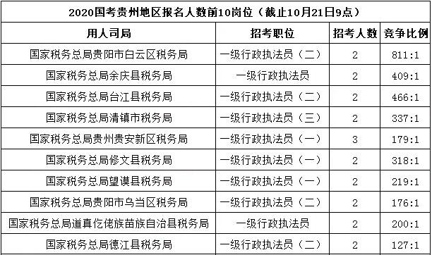 2020国考贵州地区各职位竞争激烈程度情况前10岗位(10月21日9点)