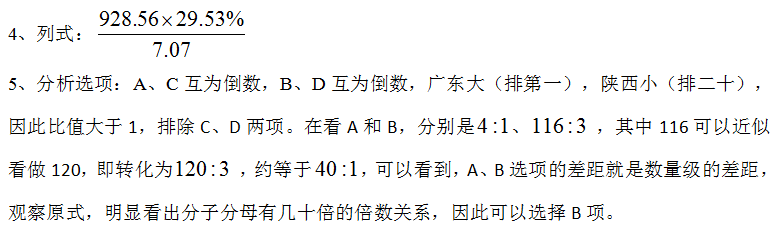根据最近几年的考试,资料分析有一些弱化计算,强调数据分析的趋势,所以在我们平时的备考过程中大家也要重视这方面的练习。在我们列式后,首先不要着急算,而是要观察分析选项,一方面要注意数量级是否相同,如果相同我们只需要算前几位有效数字就行,如果不同就要注意单位同意,然后判断大概是几位数;另一方面观察选项差距大不大,如果选项离得比较远,大概估算一下就行,反之就要尽可能的精算了。对于计算方法后期再为大家介绍。下面以一篇资料分析为例,给大家进行展示。
