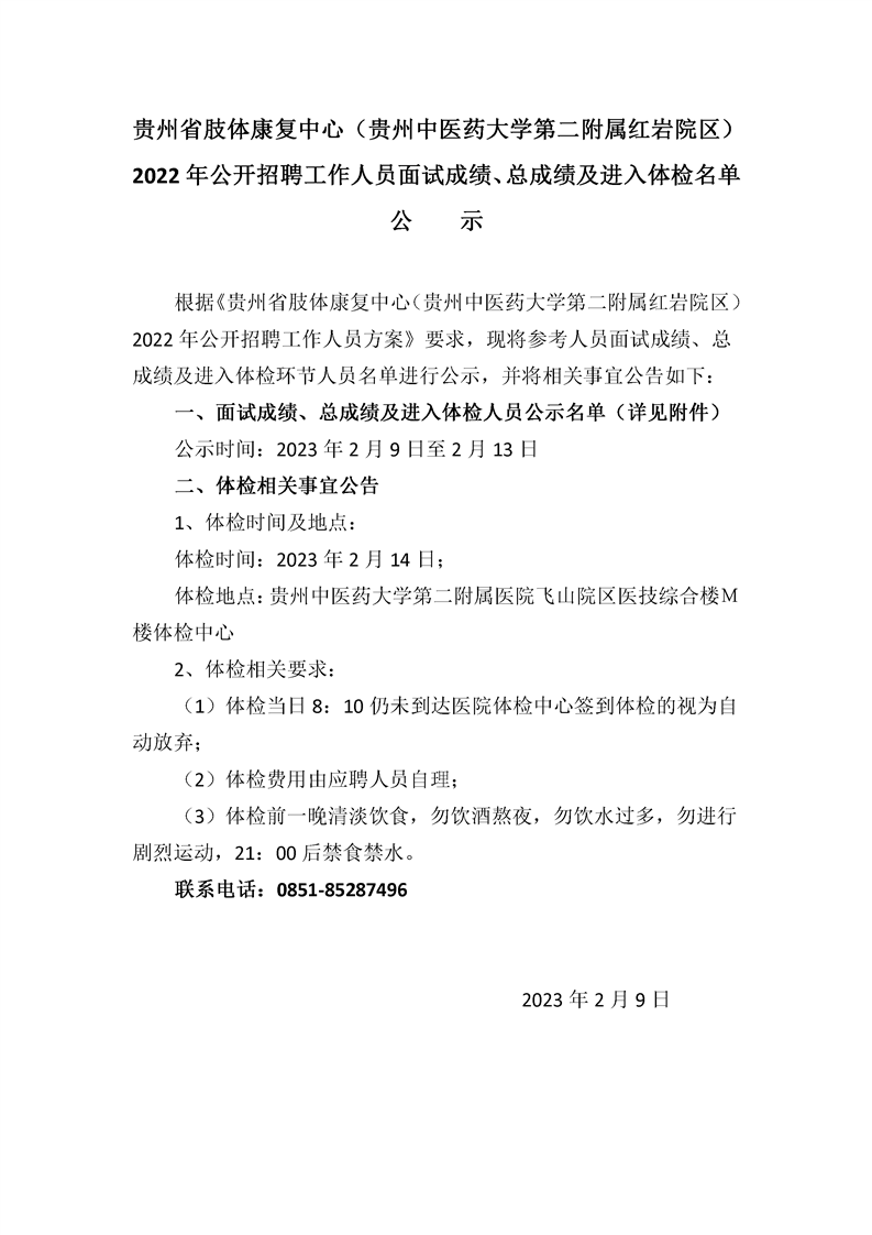 2022年贵州省肢体康复中心(贵州中医药大学第二附属红岩院区)招聘工作人员面试成绩、总成绩及进入体检名单公示