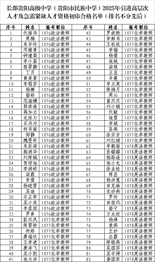 根据《贵州省人力资源和社会保障厅关于做好第十三届人才博览会事业单位引进人才有关工作的通知》(黔人社通〔2025〕5号)以及《2025年第十三届贵州人才博览会贵阳市教育局直属学校(单位)人才引进评审工作方案》有关规定,现将2025年引进高层次及急需紧缺人才初审合格人员名单及评审工作安排公布如下: