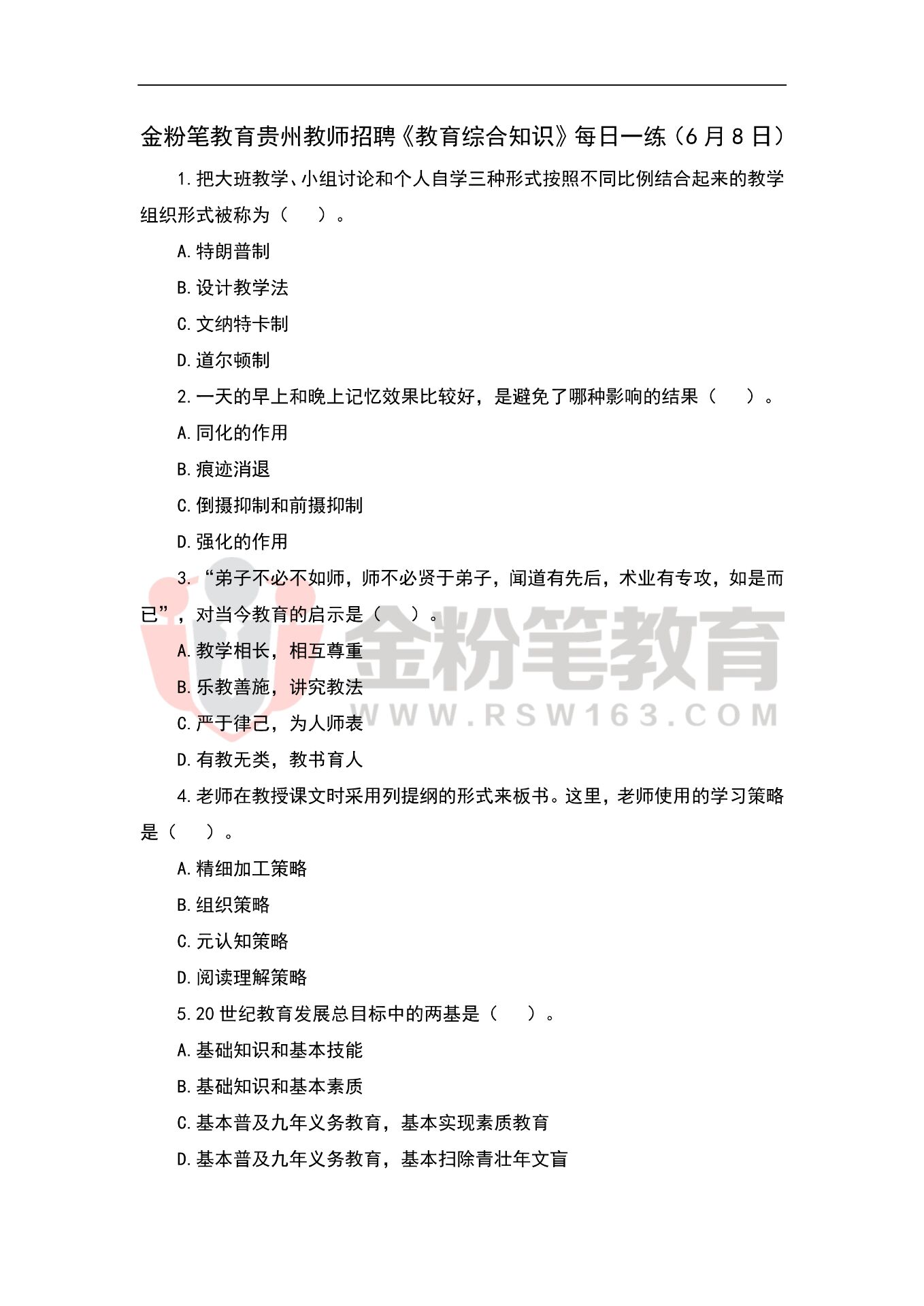 贵州教师招聘考试笔试题库提供教师招聘考试笔试科目《教育综合知识》和事业单位D类《综合应用能力》题目练习,题目包括教师考试专项练习题、模拟题、考试真题等,为了帮助考生更好的进行备考,金粉笔教育老师整理了关于《教育综合知识》教师考试题目。每日题目发布后,考生自行进行练习,更多教师招聘信息和考试题目请关注13378508157、13368515037(微同)。