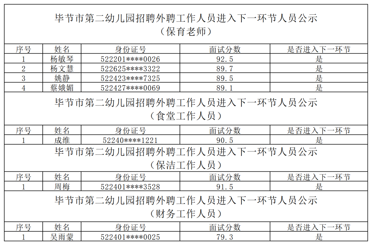 根据《毕节市第二幼儿园2024年秋季学期外聘教职工招聘公告》相关规定,毕节市第二幼儿园2024年公开招聘编外职工面试环节已结束,现将拟聘人员名单进行公示。